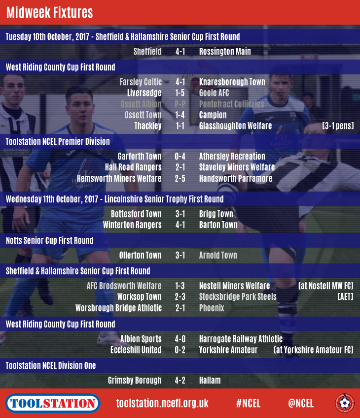 Midweek was dominated by First Round County Cup matches for a number of Toolstation NCEL sides whilst there were three games in the Premier Division and one fixture in Division One.