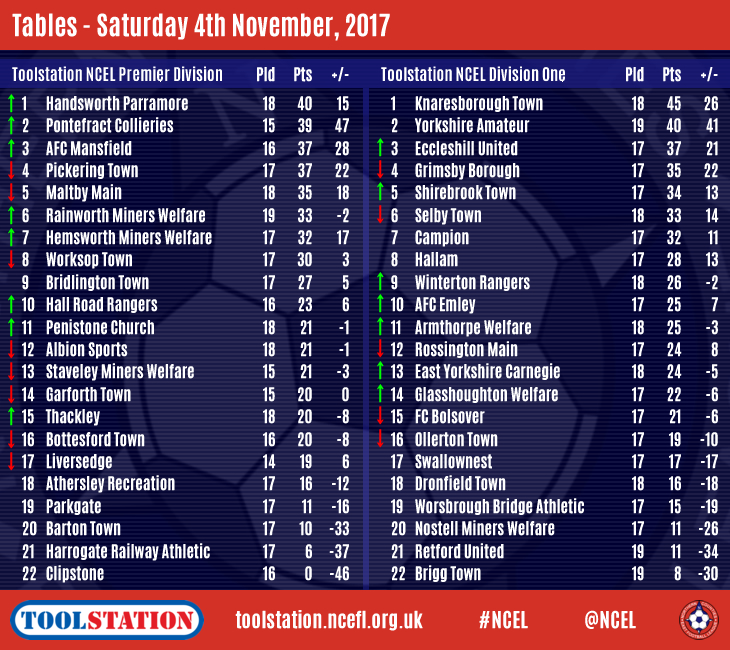 They are a point ahead of former leaders Pontefract Collieries who moved up to second with a 6-1 victory at struggling Harrogate Railway Athletic, Eli Hey, Jack Greenhough, Kane Reece, Mark Whitehouse, Michael Dunn and Vaughan Redford all getting one each for the Colls.
