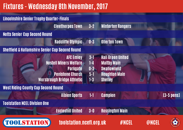 Hemsworth Miners Welfare and Worsbrough Bridge Athletic, however, were knocked out of the competition, both 3-1 at home to Grimethorpe Sports and Shelley, respectively.