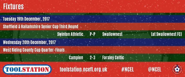 Meanwhile, in the only midweek match, Campion bowed out of the West Riding County Cup at the Quarter-Final stage at home to Farsley Celtic, Danny Stocker bringing them back to 2-2 in injury time in a dramatic finale where the visitors then struck to edge through with a 3-2 victory.