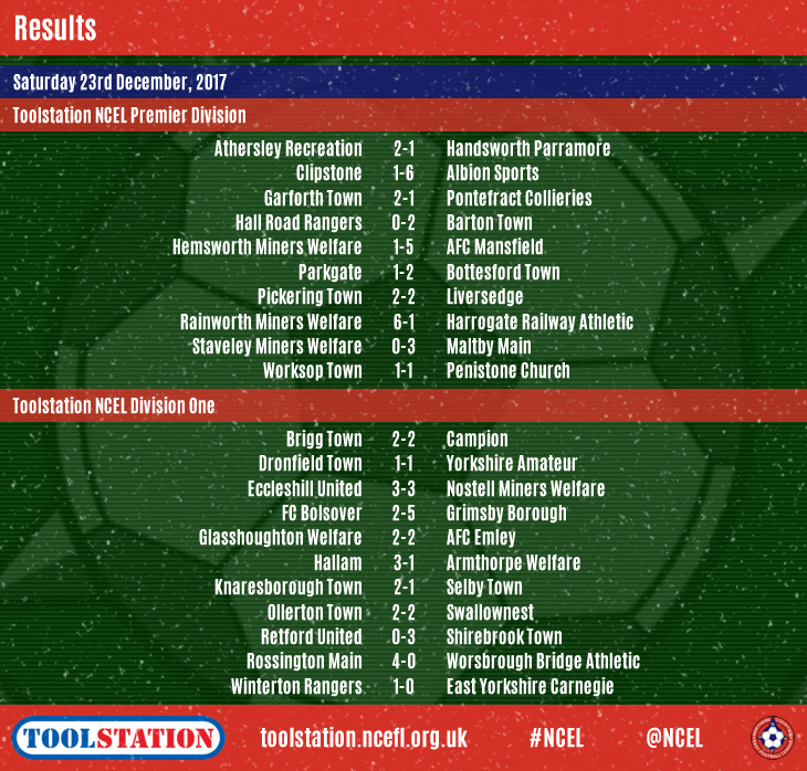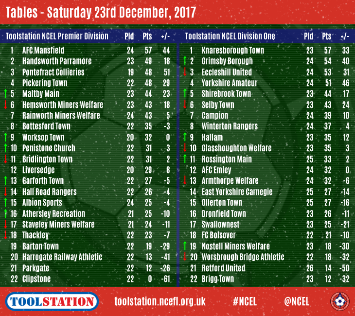 AFC Mansfield's lead at the top of the Toolstation NCEL Premier Division has grown to eight points whilst Division One's pacesetters Knaresborough Town extended their advantage to three points in the last round of matches before Christmas.