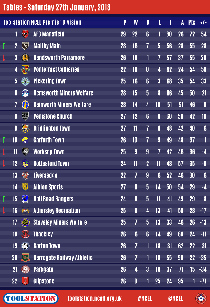 The Amber Parras drop to third, replaced in second by Maltby Main who are now seven games unbeaten following their 3-1 home win over Athersley Recreation.