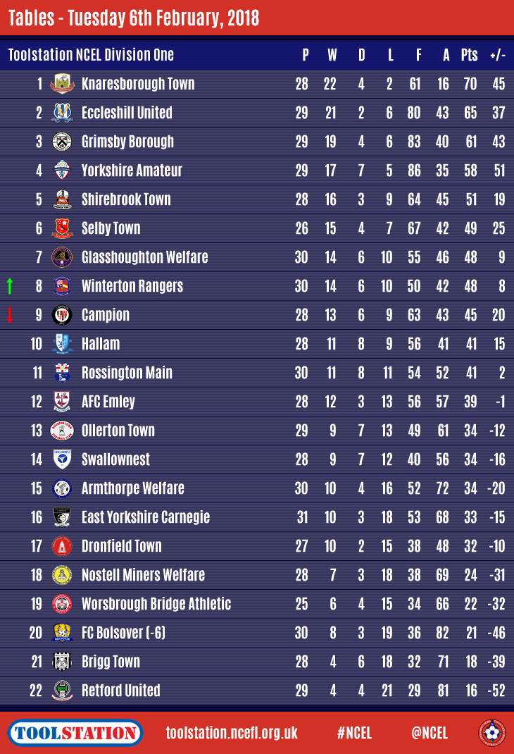 | 20 | FC Bolsover (-6) | 42 | 30 | -76 | |
