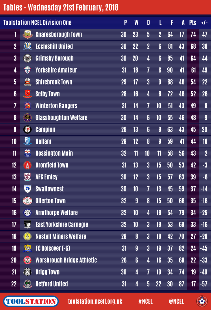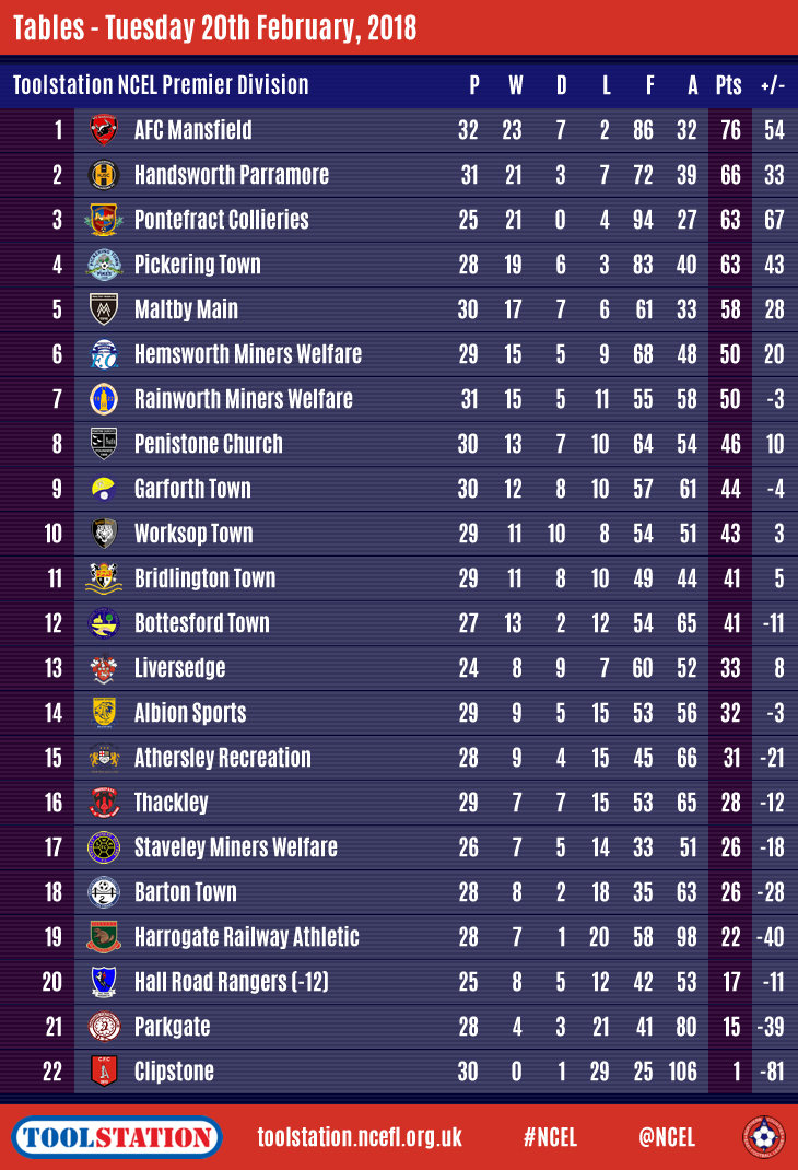 Pontefract are now thirteen points off the summit but have seven games in hand so are AFC Mansfield's biggest rivals to the trophy.