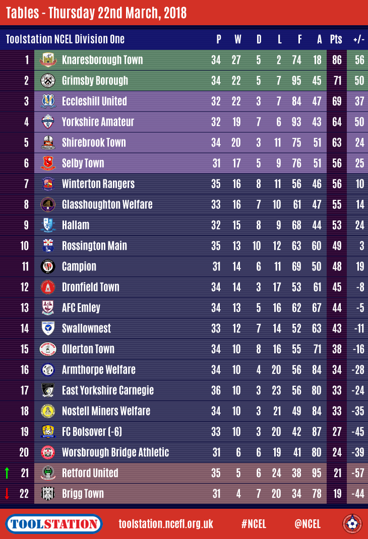 Retford have climbed out of the basement, replaced by Brigg Town, and are now just three points behind Worsbrough who are outside of the drop zone but the Briggers have four games more to play.