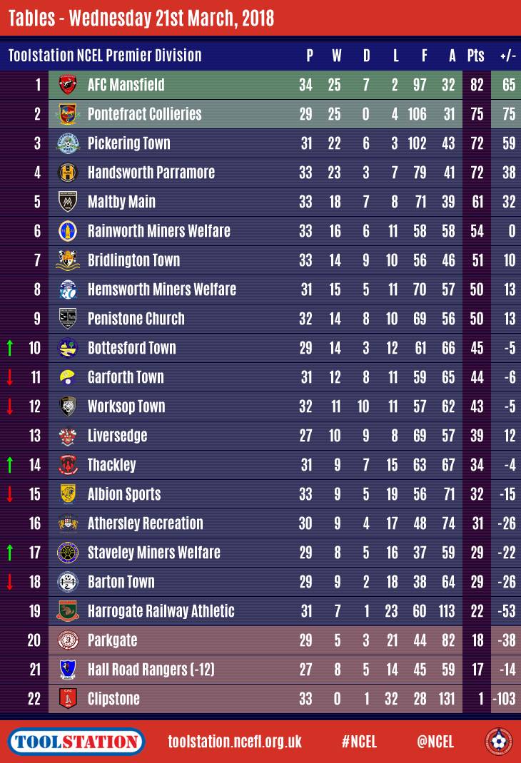In the Premier Division, Pontefract Collieries moved to within seven points of leaders AFC Mansfield with five games in hand as they won 3-1 at next-to-bottom Hall Road Rangers.
