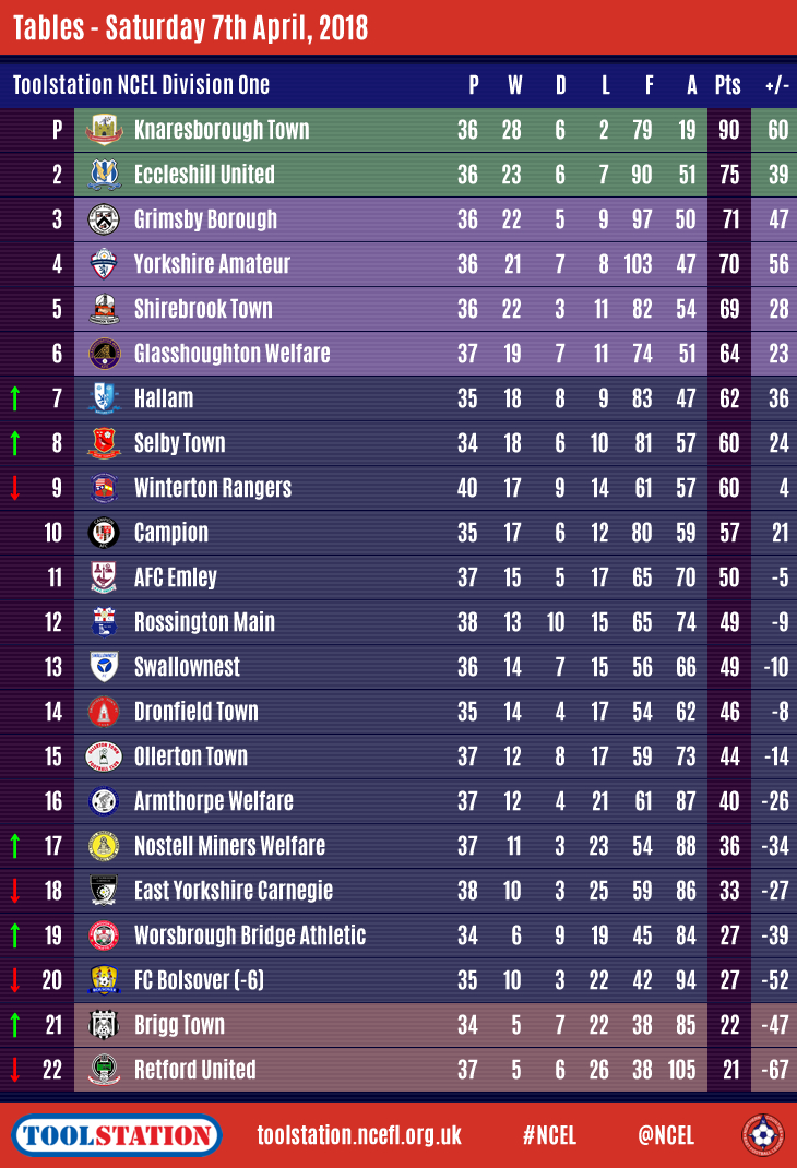 In Division One, congratulations to champions elect Knaresborough Town whose 1-1 home draw with second-placed Eccleshill United confirmed their promotion with six games to spare.
