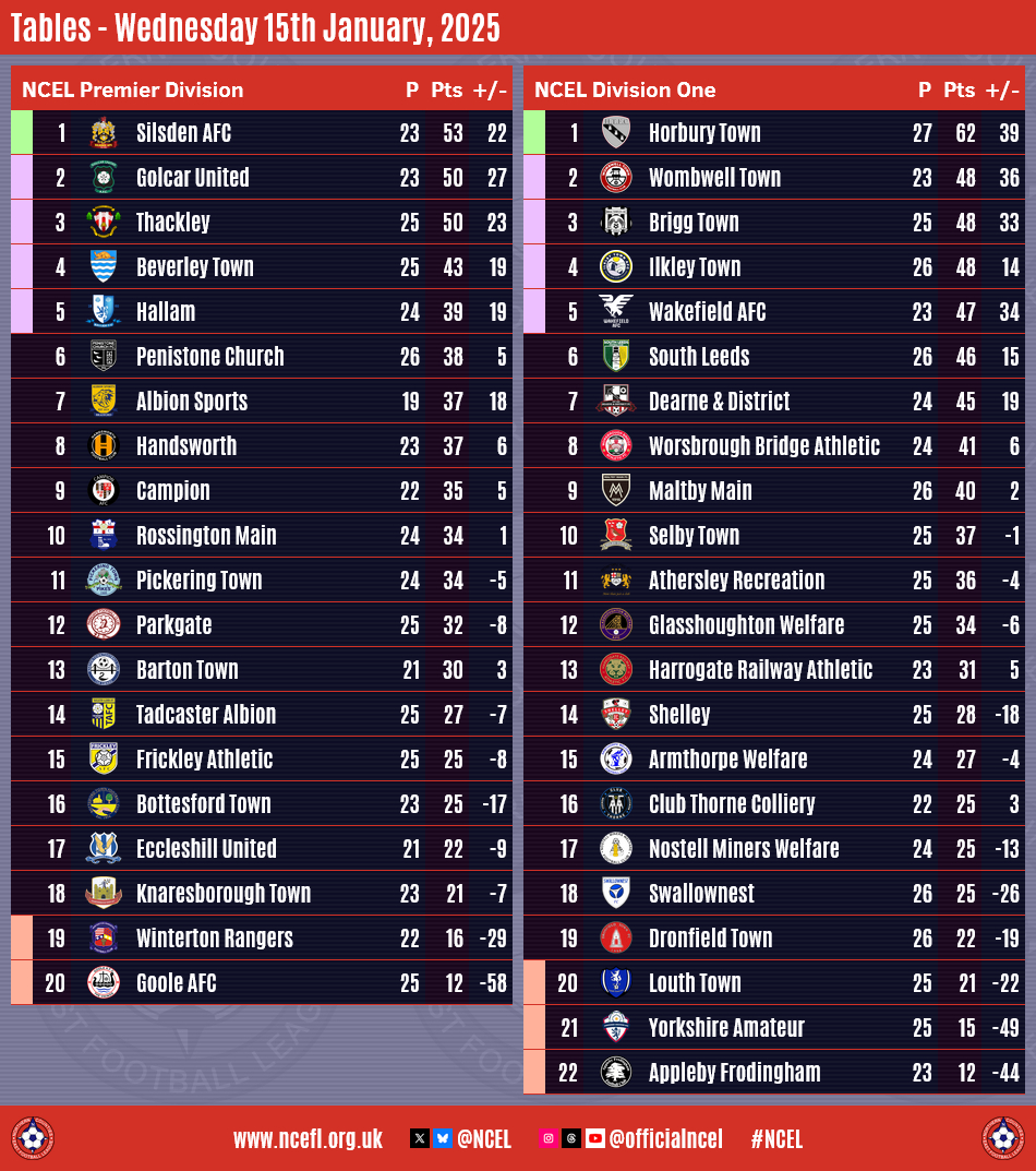The stop-start beginning to 2025 continued in midweek with six postponements and one abandonment due to the bad weather, leaving just four matches played to a conclusion as many NCEL clubs continued to endure an unplanned winter break.Ilkley Town were involved in West Riding County Cup action as the Division One side travelled to Pitching In Northern Premier League hosts Pontefract Collieries in their Quarter-Final tie.