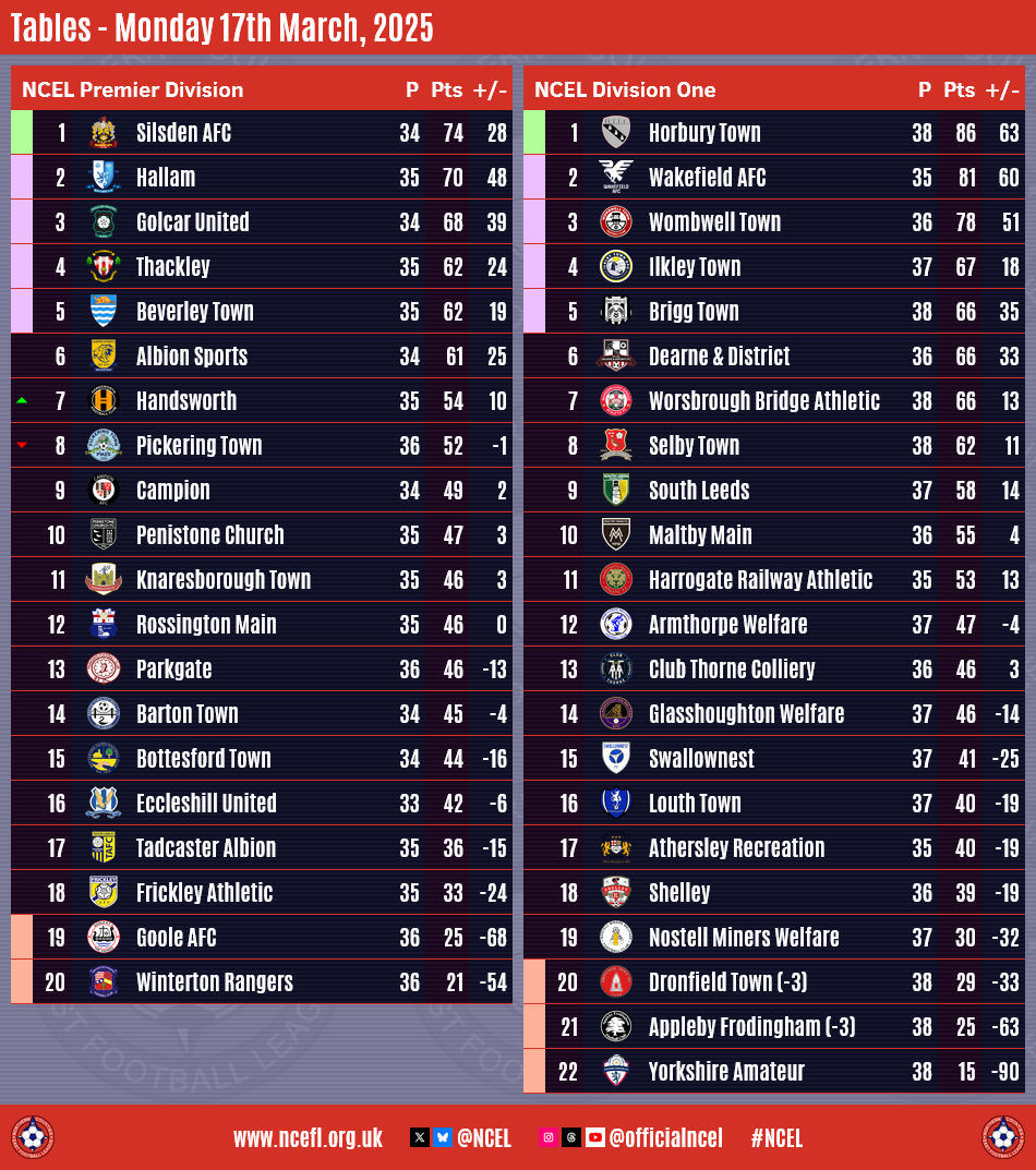 Silsden are now seven points clear of Hallam with three games to play whilst third placed Golcar are nine points behind with a further match left in their season.