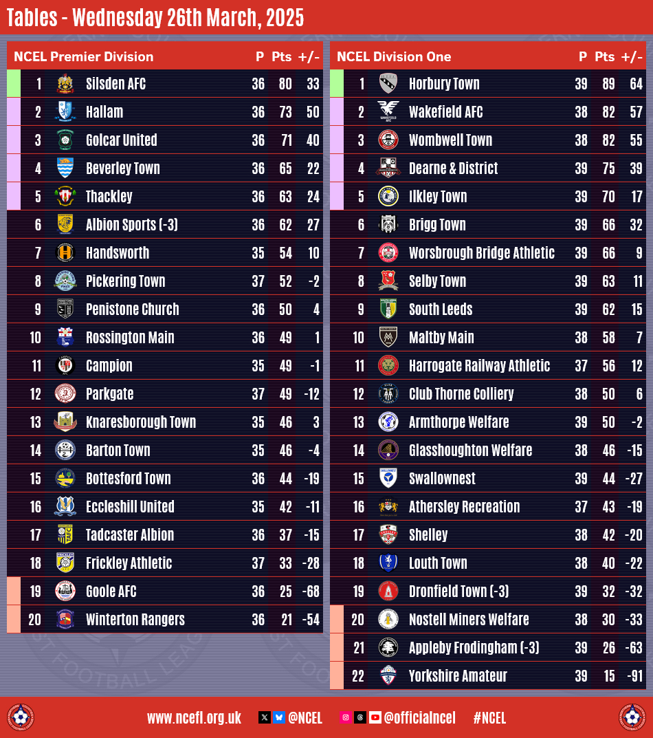 Wakefield, meanwhile, remain seven points behind Horbury in second with one game in hand, keeping ahead of
