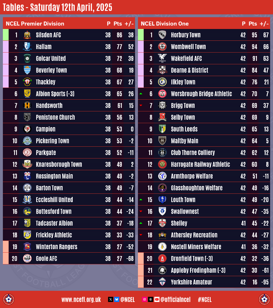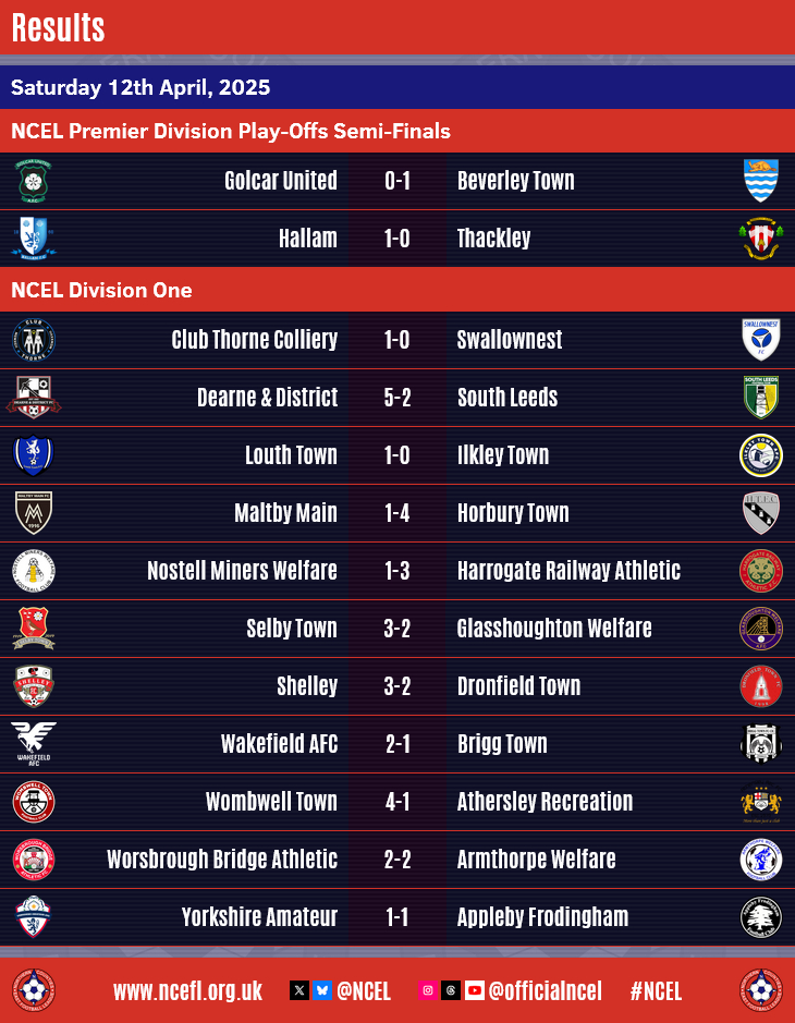 Congratulations to Horbury Town whose 4-1 victory at Maltby Main on Saturday afternoon means they are NCEL Division One champions whilst Beverley Town and Hallam both won to book their places in next weekend's Premier Division Play-Off Final.Horbury went into the last round of matches one point ahead of