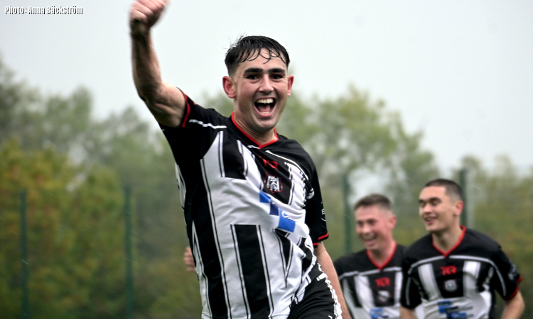 Photo: Mason Ellender celebrates scoring Brigg Town's second in their 4-1 win at Route One Rovers on Saturday that lifts the Zebras up into sixth in Macron NCEL Division One. (Picture: Anna Bäckström)
