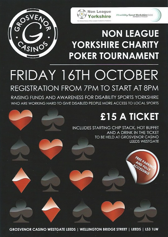 Clubs across Yorkshire, including representatives from the Toolstation NCEL, are taking part in a charity poker tournament next month at Grosvenor Casino Leeds Westgate to raise money for Disability Sport Yorkshire.Non League Yorkshire is hosting the event on Friday 16th October for which clubs, players, officials and supporters are invited to attend.