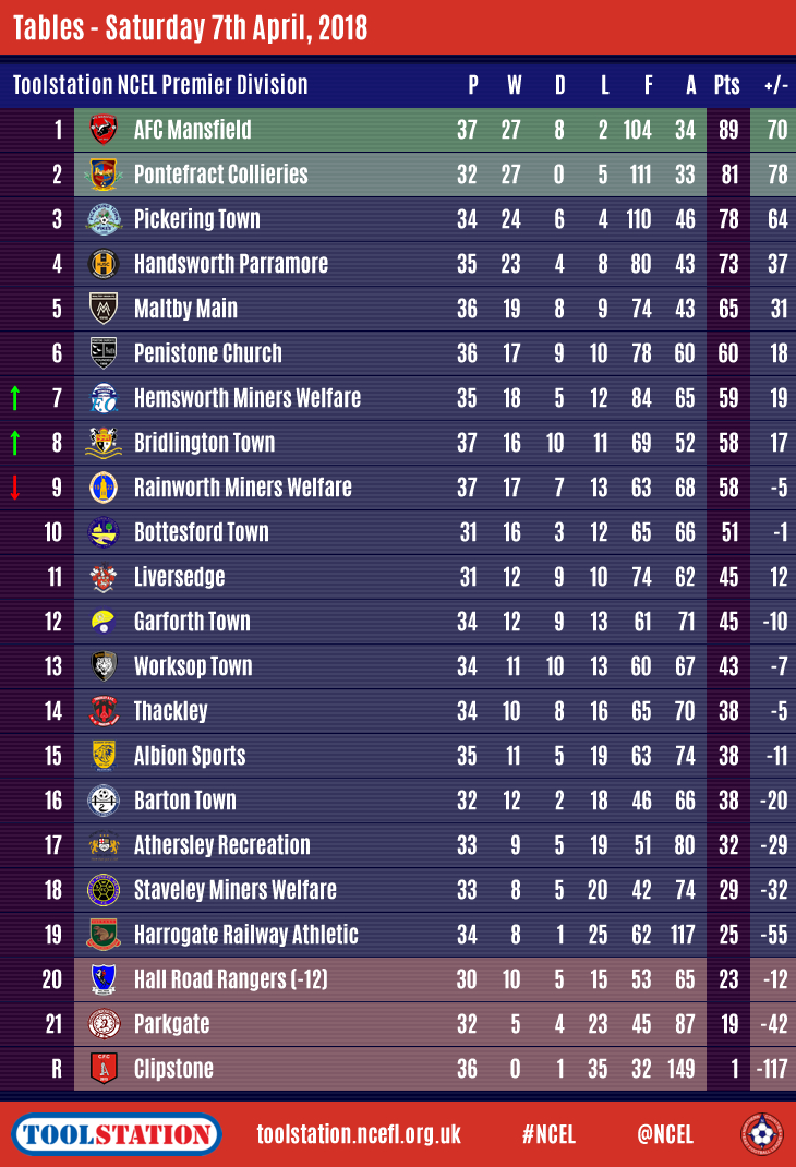 Rangers remain in the bottom three but have four games in hand on Railway whilst Parkgate inched a bit closer to safety with their 1-1 draw at Rainworth Miners Welfare, Andrew Fox's 71st minute penalty cancelling out a Steven Wankiewicz opener for the home side, leaving the Steelmen six points behind but with two more matches to play than Harrogate.