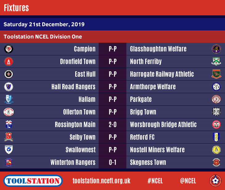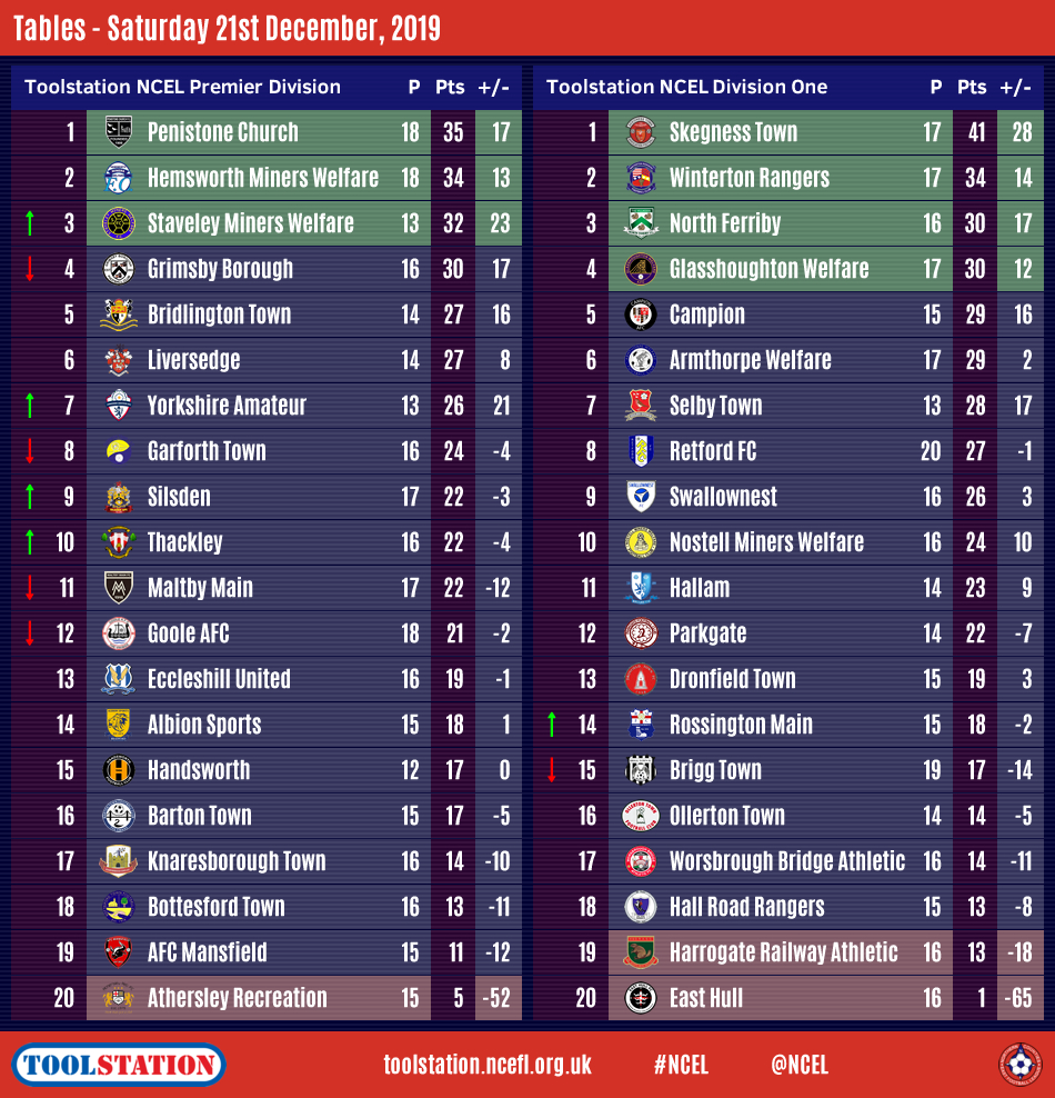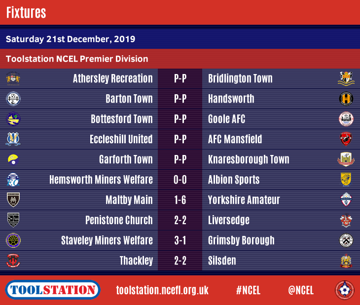 The last round of Toolstation NCEL matches before Christmas was badly affected with only seven of the twenty scheduled fixtures going ahead as the wet weather continued to cause disruption as it has done for the past two months.Penistone Church remain at the top of the Premier Division despite dropping points at home in a 2-2 draw with sixth-placed