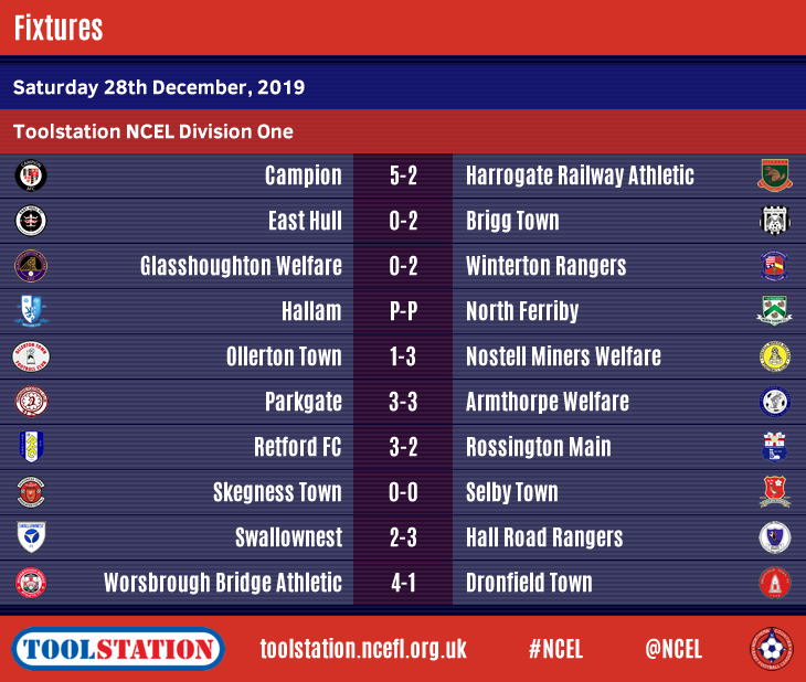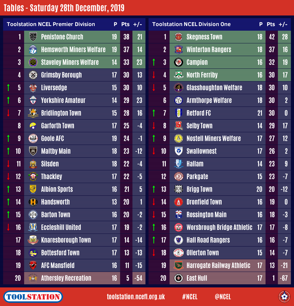 Penistone Church and Skegness Town are the Toolstation NCEL Premier Division and Division One leaders going into the New Year after an almost full compliment of matches brought 2019 to an end on Saturday.Only one fixture was postponed -