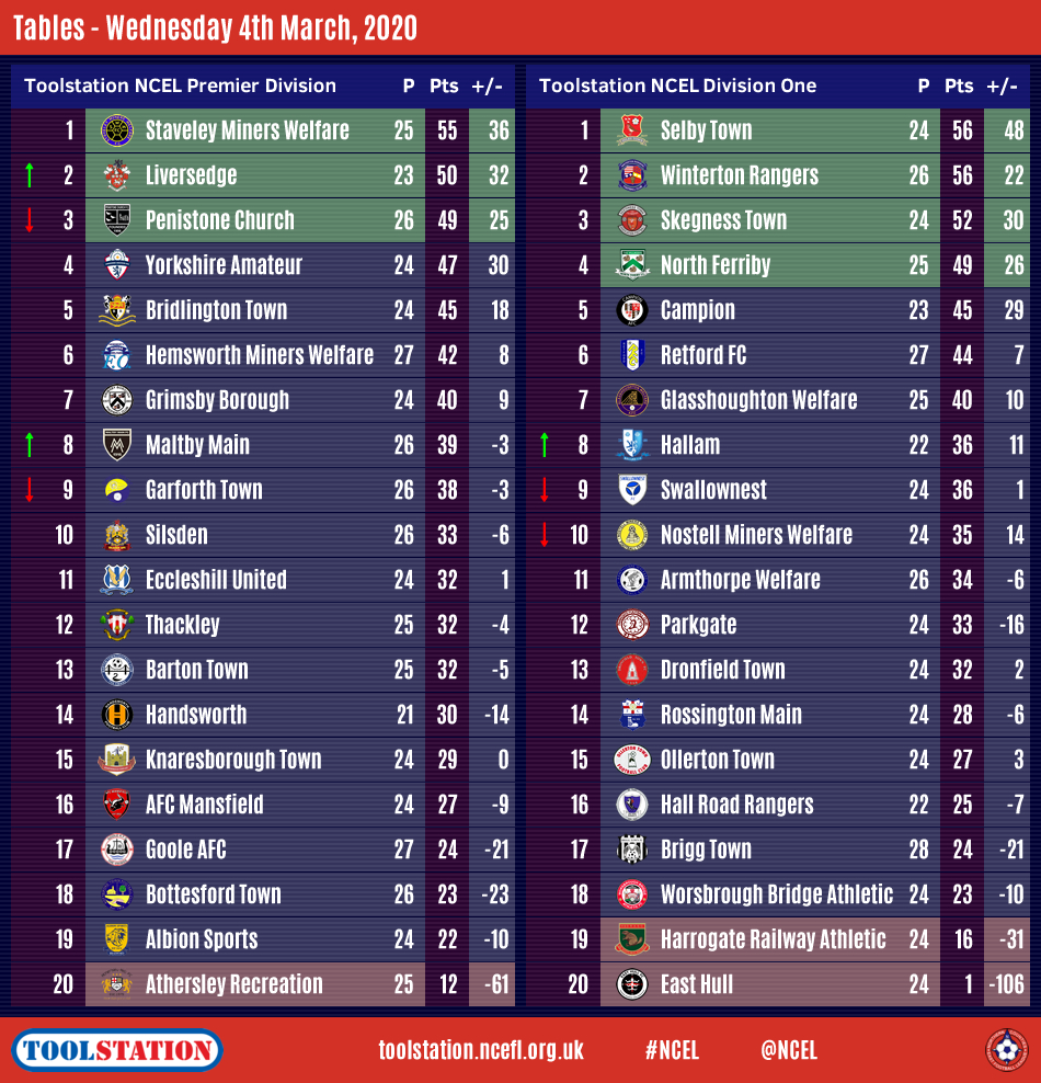Hemsworth Miners Welfare and Eccleshill United went through to the quarter-finals of the Toolstation NCEL League Cup in midweek whilst leaders Staveley Miners Welfare and Selby Town both won in the chases for the Premier Division and Division One title, respectively.For the first time since the beginning of December, all matches scheduled for midweek were played at the start of what will be a busy final two months of the 2019/20 season.