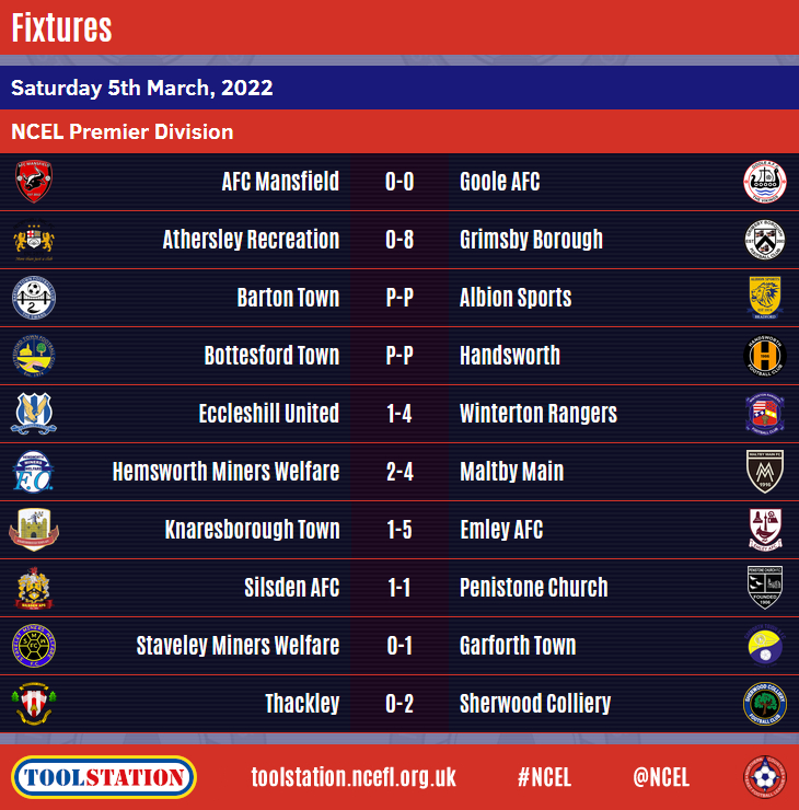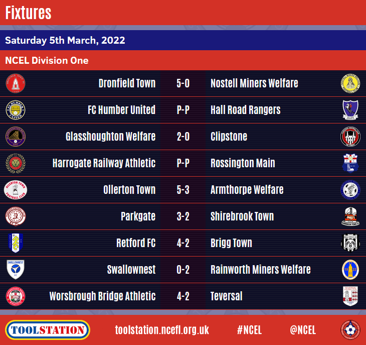 Owen Lester, Jake Hatton, Callum Mawbey, Mark Fereday and Connor Chapell scored one each for Dronfield Town in their 5-0 home win over Nostell Miners Welfare whilst Ollerton Town defeated visitors Armthorpe Welfare 5-3 in an enthralling game, Luke Francis with two of the hosts' goals.