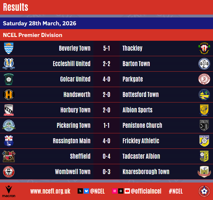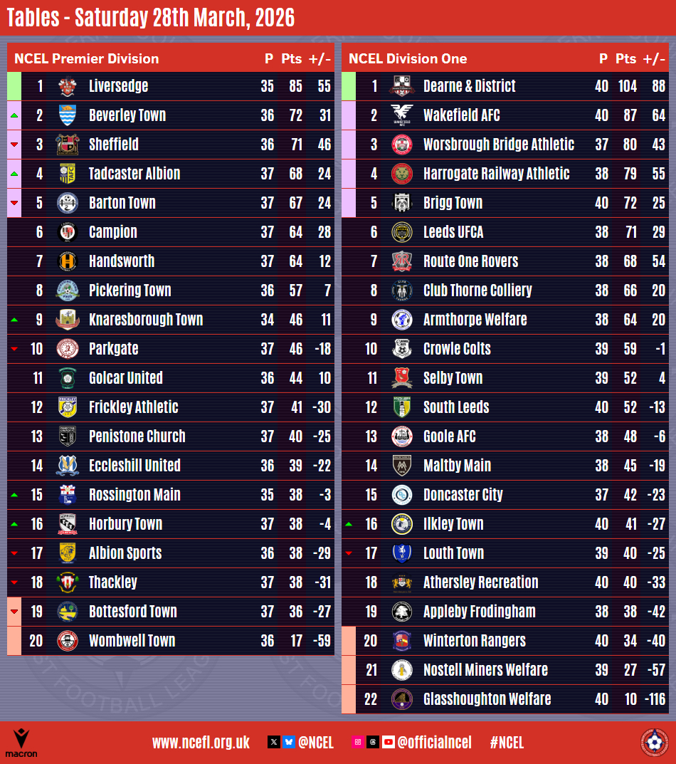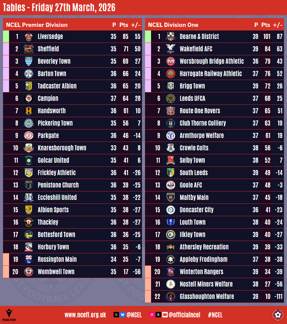 We now know three of the four sides who will take part in this season's Premier Division Play-Offs after the weekend's Macron NCEL action with Beverley Town and Tadcaster Albion booking their places.Beverley's berth was confirmed on Friday night as