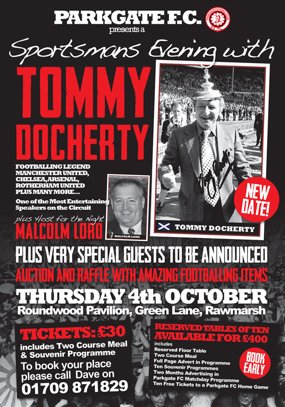Tickets are now on sale for Parkgate's inaugural Sportsman's Evening which has been re-arranged to be held at the Roundwood Pavilion on Thursday 4th October.The legendary Tommy Docherty is guest speaker with the highly entertaining Malcolm Lord hosting the night.